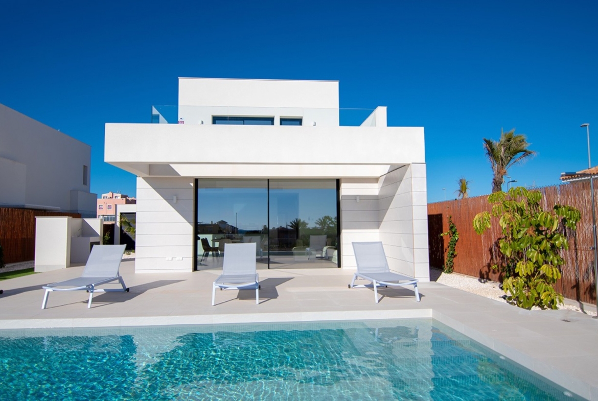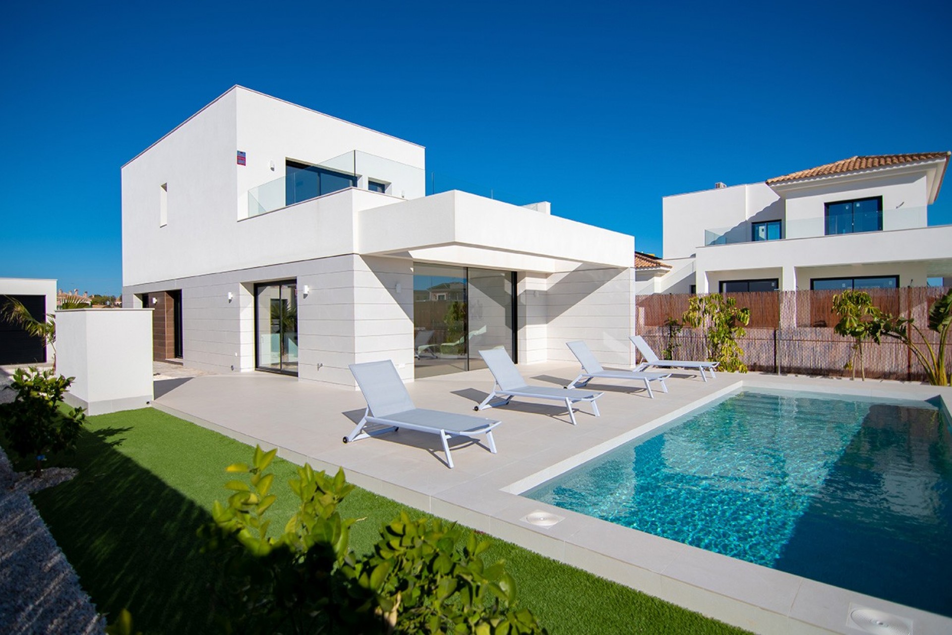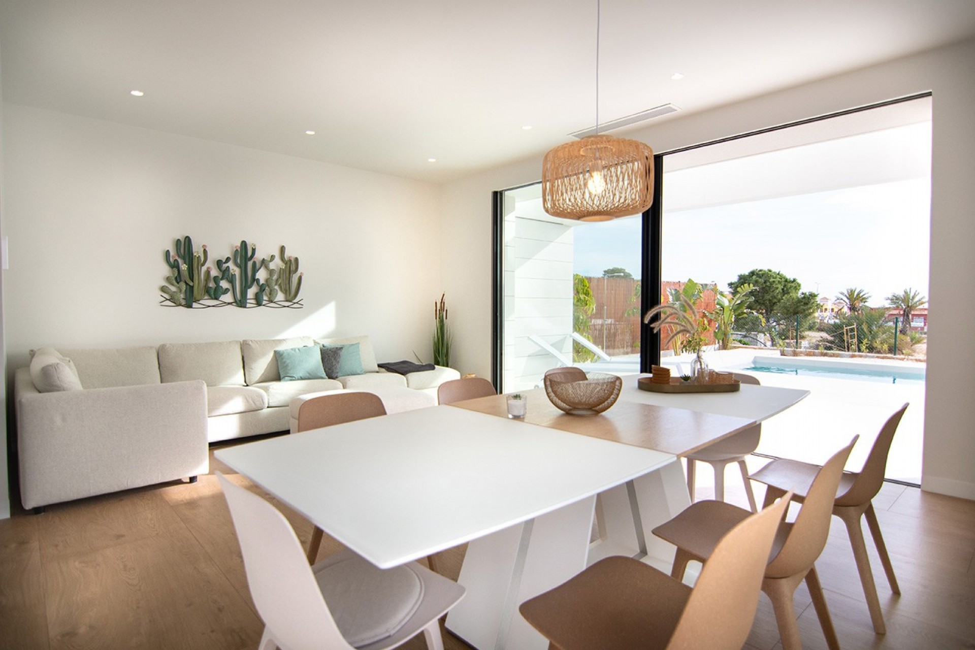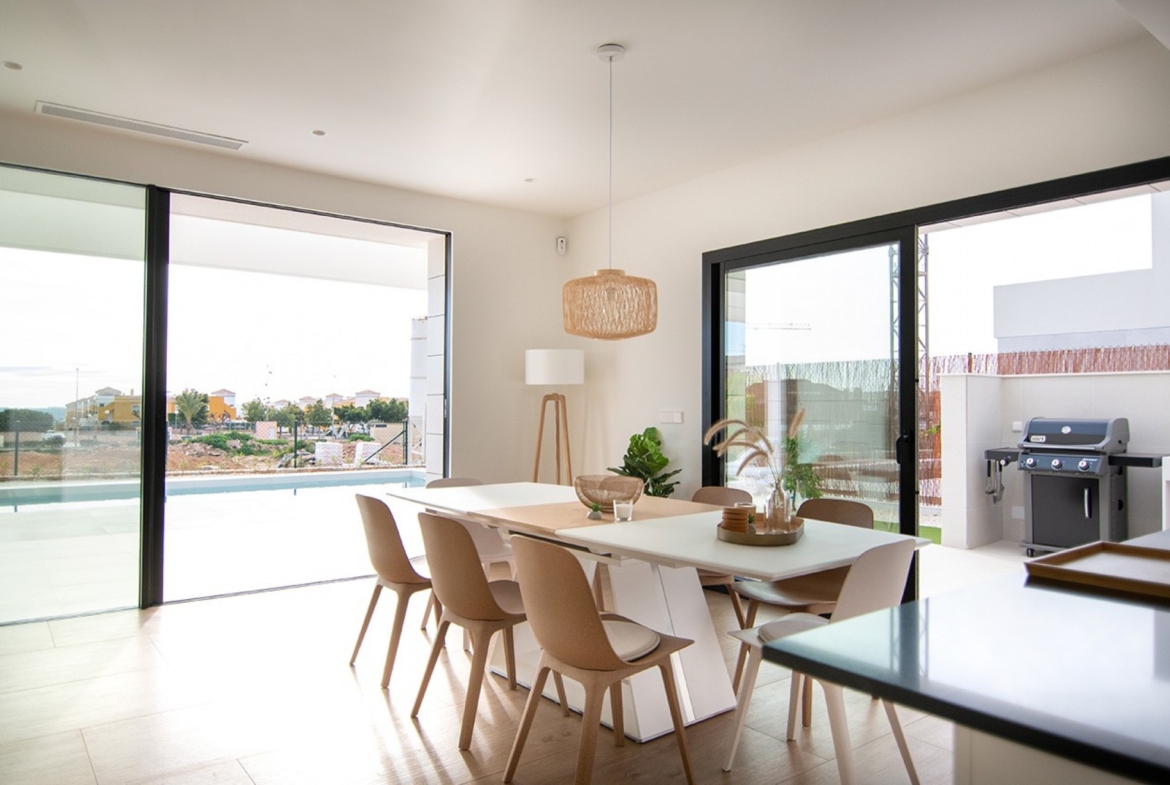 Located 200 metres from supermarkets, restaurants and bars, you will find these spacious 4 bedroom villas in La Herrada, Los Montesinos. Each comes with private pool and to a high standard. The average plot size is 435 m2.  As you enter the villa, you will find an entrance hall with a wardrobe for hanging jackets, etc. Opposite you will find an open plan kitchen, a dining room and a living room. The large windows bring a lot of natural light into the property. Behind the kitchen you will find two spacious double bedrooms, a bathroom and a practical utility room under the staircase to the first floor.  On the first floor you will find another guest toilet, bathroom and the master bedroom. The master bedroom has an en-suite bathroom. From the master bedroom and a hallway you access the 30 m2 solarium, from where you overlook the private terrace, the garden and the surroundings, including the salt lake of Torrevieja and the natural lagoon.  Each plot offers private parking, storage room and plenty of terrace space plus a 4×8 metre private swimming pool.  The villas come with 4 bedrooms as standard. However, you also have the possibility to remove one of the bedrooms on the ground floor and have an even larger kitchen, dining room and living room.  The villas are located in the charming village of Los Montesinos. Here you will find a good selection of restaurants, supermarkets and shops. The beautiful square next to the town hall offers the real Spanish atmosphere. A short drive takes you to Torrevieja, Ciudad Quesada or the stunning sandy beaches of La Mata.