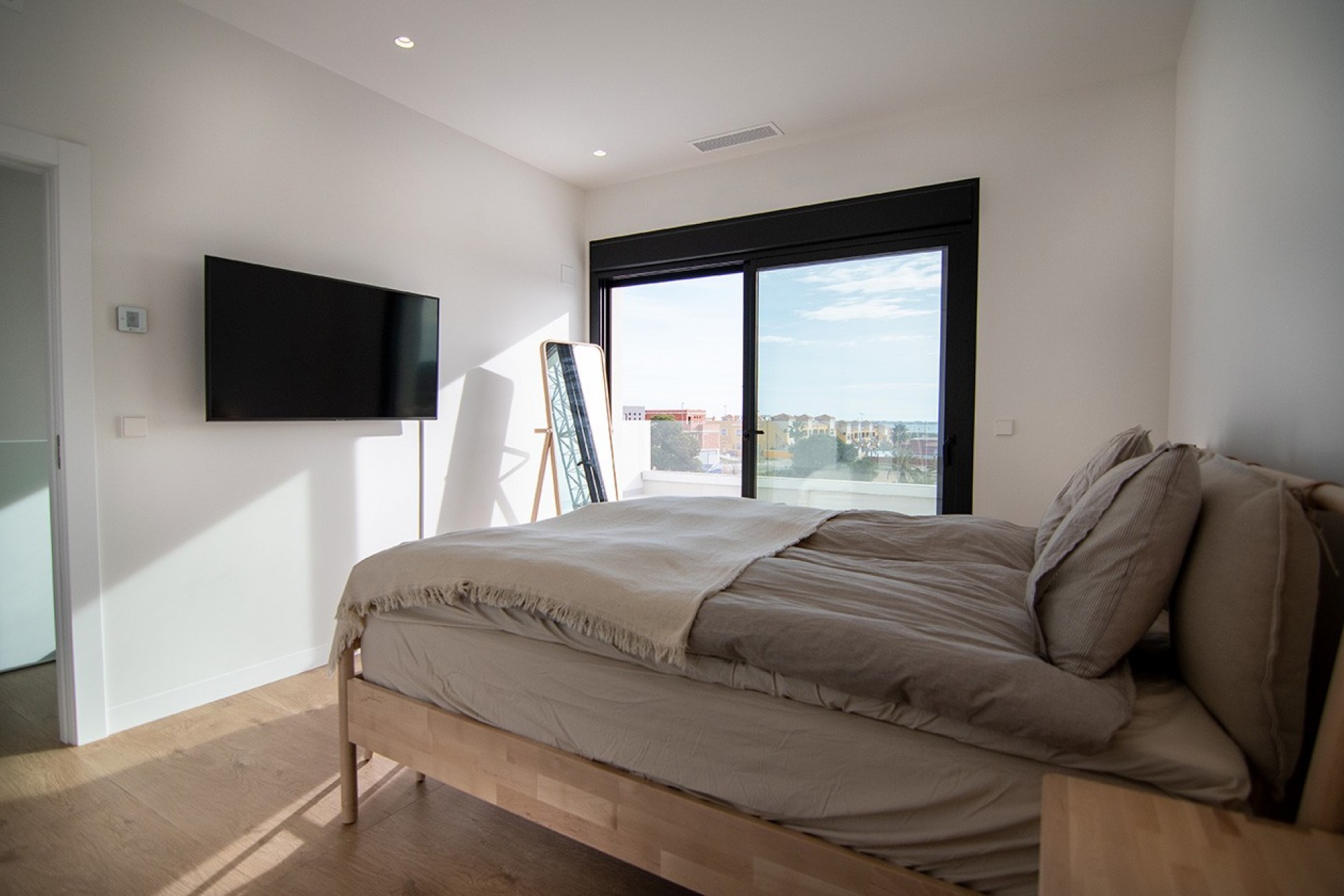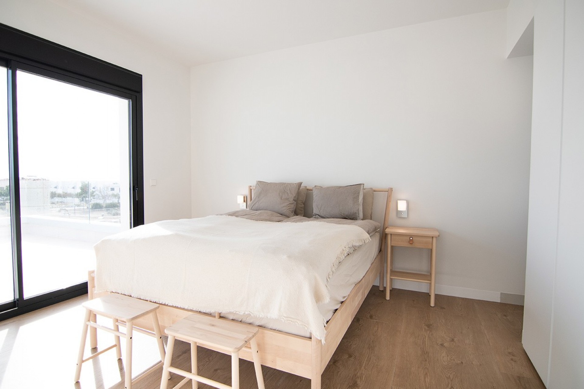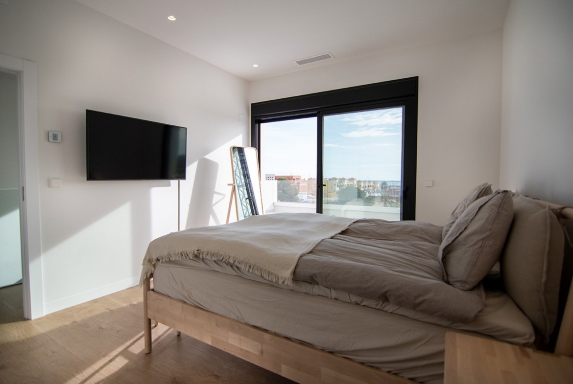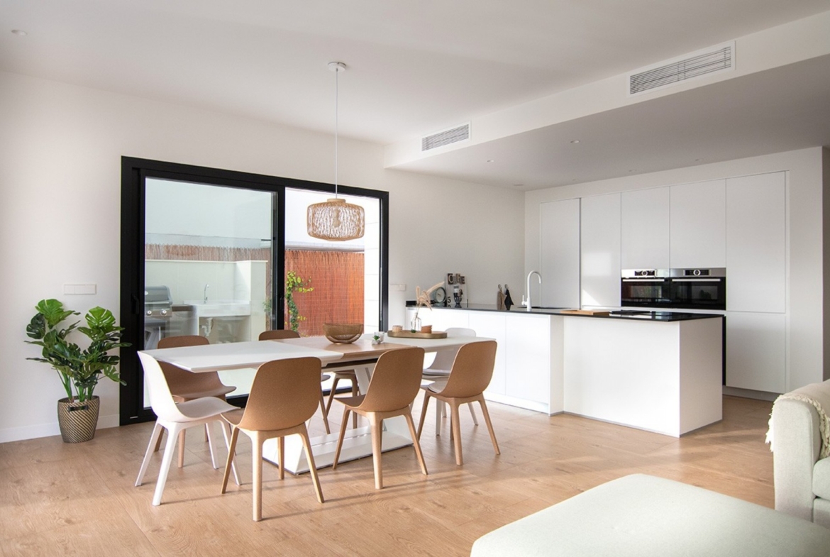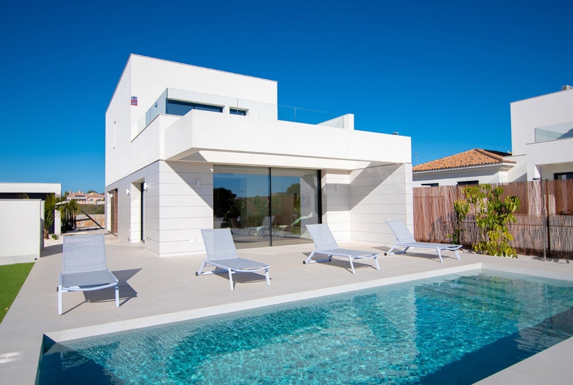 Located 200 metres from supermarkets, restaurants and bars, you will find these spacious 4 bedroom villas in La Herrada, Los Montesinos. Each comes with private pool and to a high standard. The average plot size is 435 m2.  As you enter the villa, you will find an entrance hall with a wardrobe for hanging jackets, etc. Opposite you will find an open plan kitchen, a dining room and a living room. The large windows bring a lot of natural light into the property. Behind the kitchen you will find two spacious double bedrooms, a bathroom and a practical utility room under the staircase to the first floor.  On the first floor you will find another guest toilet, bathroom and the master bedroom. The master bedroom has an en-suite bathroom. From the master bedroom and a hallway you access the 30 m2 solarium, from where you overlook the private terrace, the garden and the surroundings, including the salt lake of Torrevieja and the natural lagoon.  Each plot offers private parking, storage room and plenty of terrace space plus a 4×8 metre private swimming pool.  The villas come with 4 bedrooms as standard. However, you also have the possibility to remove one of the bedrooms on the ground floor and have an even larger kitchen, dining room and living room.  The villas are located in the charming village of Los Montesinos. Here you will find a good selection of restaurants, supermarkets and shops. The beautiful square next to the town hall offers the real Spanish atmosphere. A short drive takes you to Torrevieja, Ciudad Quesada or the stunning sandy beaches of La Mata.