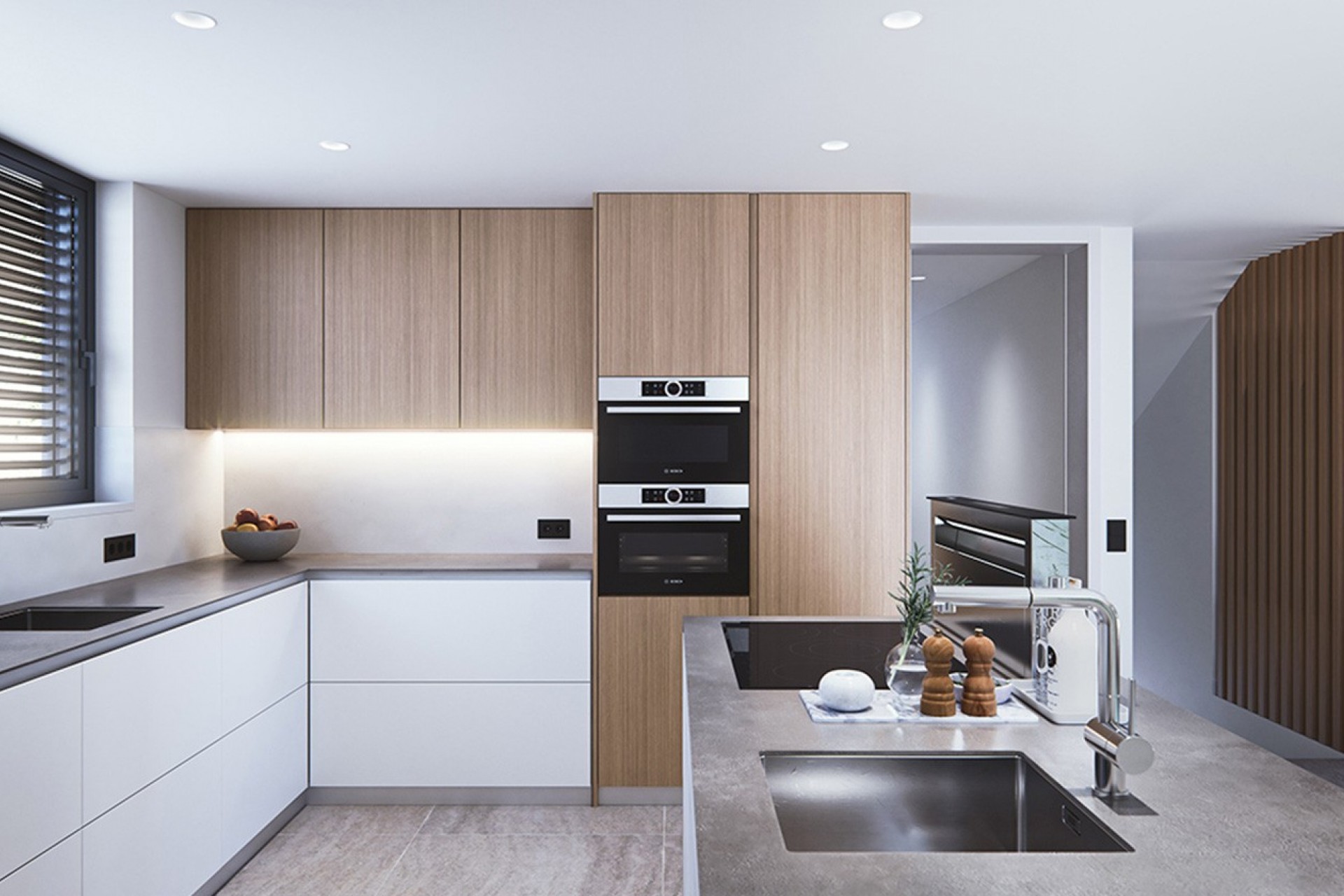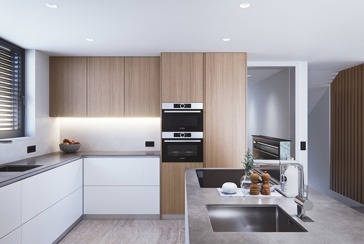 The modern and elegant eat-in kitchen is fully customizable, including high-end appliances embedded in the design and an integrated wine cellar.
