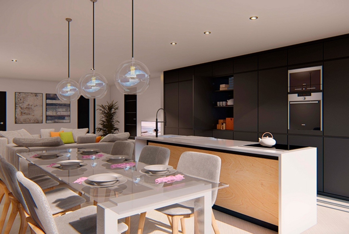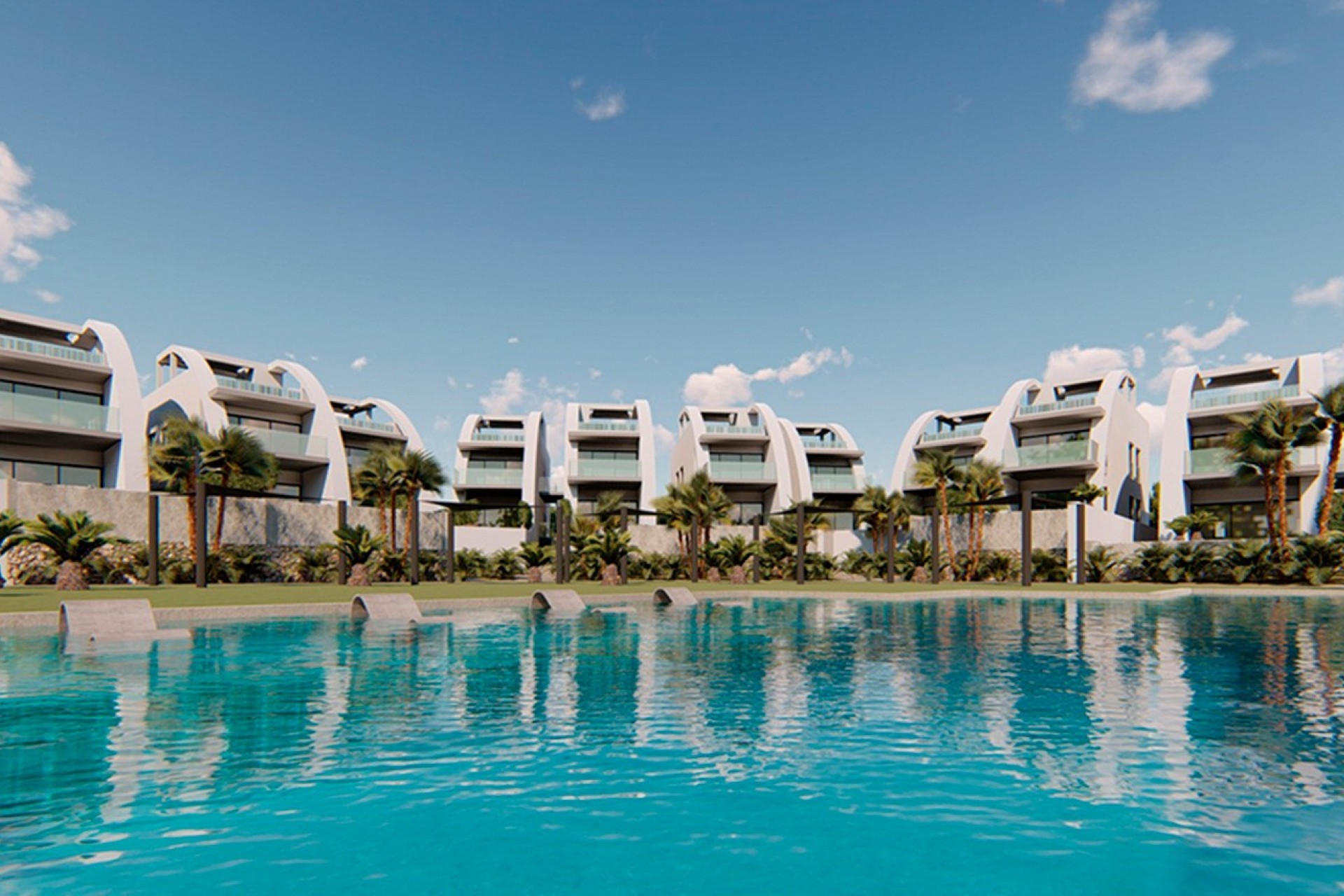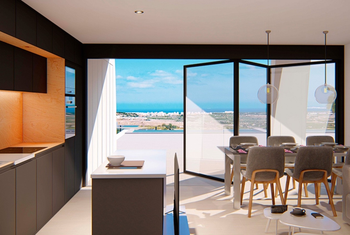 These unique and modern design flats have a magnificent view over the skyline of Guardamar del Segura. You will find here the perfect combination of sea views, nature, a luxury lifestyle and within walking distance to Rojales with all its restaurants, supermarkets and golf course. The high quality design of the Oceanic Luxury Apartments is one of the best and unique on the Costa Blanca. There are several models available, you can choose between a ground floor with plot and private pool or a first floor with solarium and lift also with private pool. They have 3 bedrooms, 3 bathrooms (1 of them en suite), open plan kitchen with lounge and terrace. The communal areas include outdoor and indoor swimming pool, gardens, GYM, barbecue, sauna, jaccuzi and all the luxury you can imagine. The beaches of Guardamar del Segura are a 10 minute drive and Alicante airport is 30 minutes away. Please contact us for more information, or join one of our no-obligation tours to visit this wonderful project.